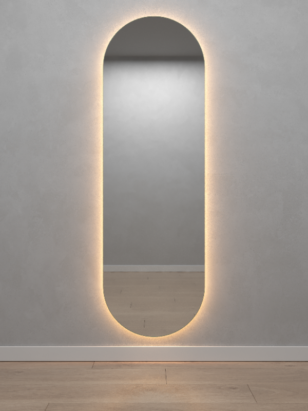 Безрамное зеркало овальной (капсульной) формы с контурной (тыльной) тёплой подсветкой, свет 3000К. Подложка из высококачественного МДФ, светодиодная лента защищена матовым свето-рассеивателем от попадания пыли и влаги. Есть вывод 220W для подключения к сети, включение подсветки от выключателя на стене, либо от розетки. Возможно установить сенсорную кнопку на заказ в любом месте зеркала.